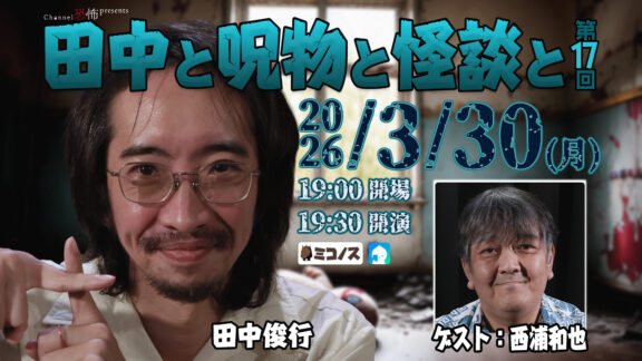 2026/3/30 オカルトコレクター・田中俊行氏が持参した様々ないわくや歴史を持つ呪物たちを紹介。それら呪物の見た目や、解説を聞いて思い出した怪談をゲストが語るという呪物と怪談のイベントです。第17 […]