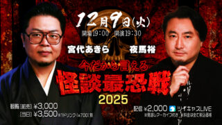 2025/12/9 大盛況の内に幕を閉じた「怪談最恐戦2025」。七代目怪談最恐位は吉田猛々さん。 素晴らしい怪談を披露してくれた怪談師たちの闘いを影で支えた男たち。それが今回実行委員を務めた夜馬裕氏 […]