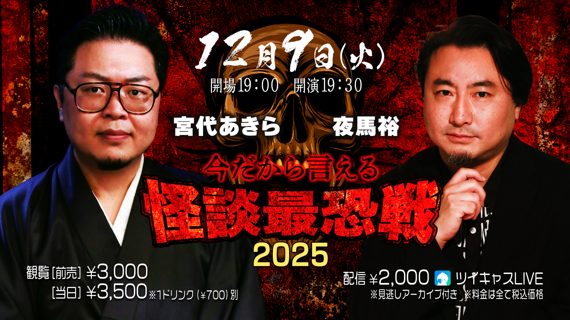 素晴らしい怪談を披露してくれた怪談師たちの闘いを影で支えた男たち。それが今回実行委員を務めた夜馬裕氏と宮代あきら氏。そんな二人をお迎えして、今だから言える大会開催までの話から開催中の怪談師たちの裏側をあますことなくお話ししちゃいます。そしてもしも二人が決勝戦に進んだなら話すかもしれなかった怪談を披露!「怪談最恐戦2025」番外編ともいえる大会の興奮をもう一度!